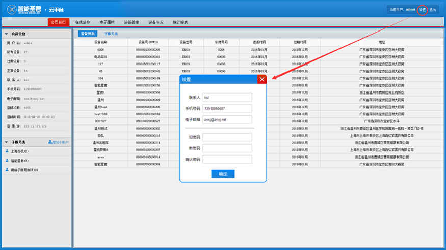 主账号下面可以新建多个子账号,子账号可以单独登录查车平台查看设备信息,但无法修改管理设备