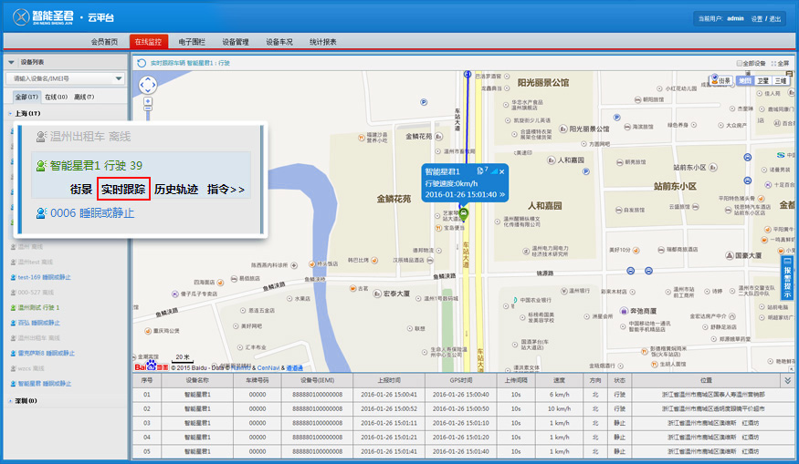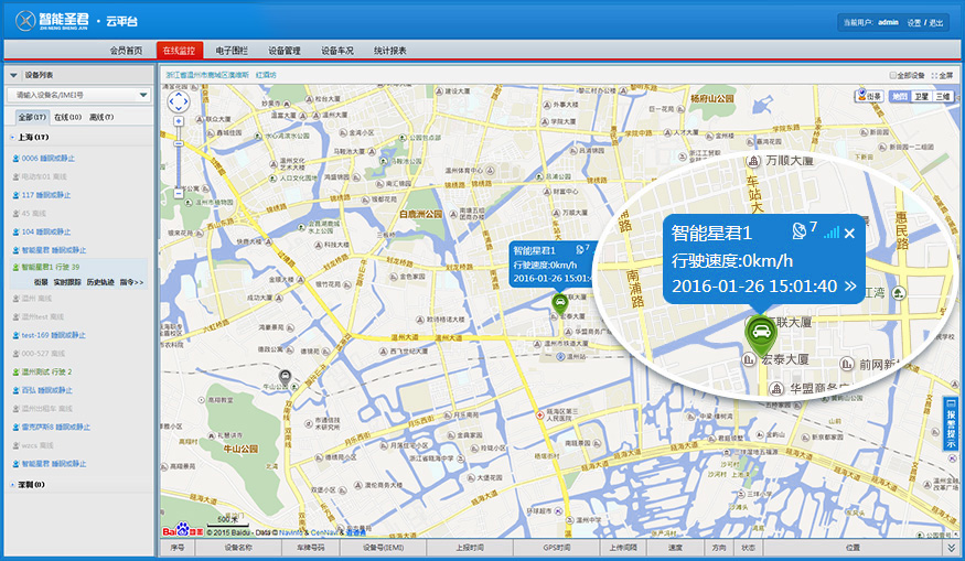 。点击设备名称,可显示地图浮动框,浮动框内便显示车辆详细位置信息如(设备名称、接收时间、速度 信号强度等信息)