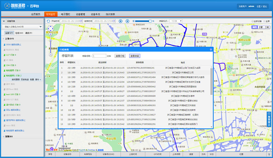 轨迹播放完毕后,点击查看行程按钮,则弹出详细的