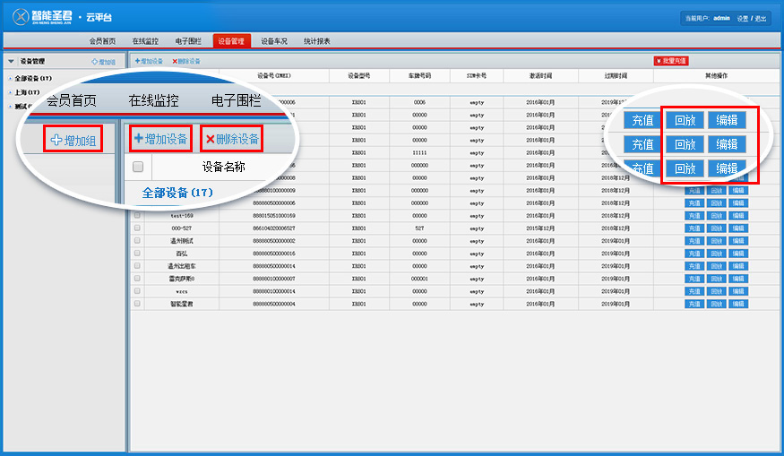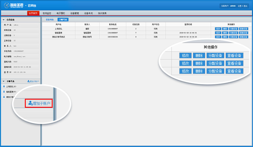 查看此子账号下面的设备,进行充值、编辑、查看等操作